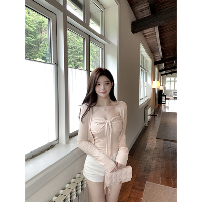若语定制 慵懒欧尼 纯欲气质裸杏蝴蝶结抹胸+针织开衫外套早秋套