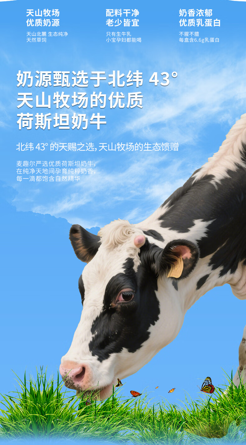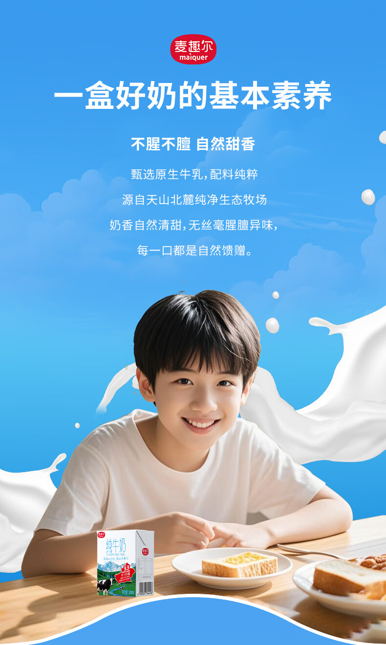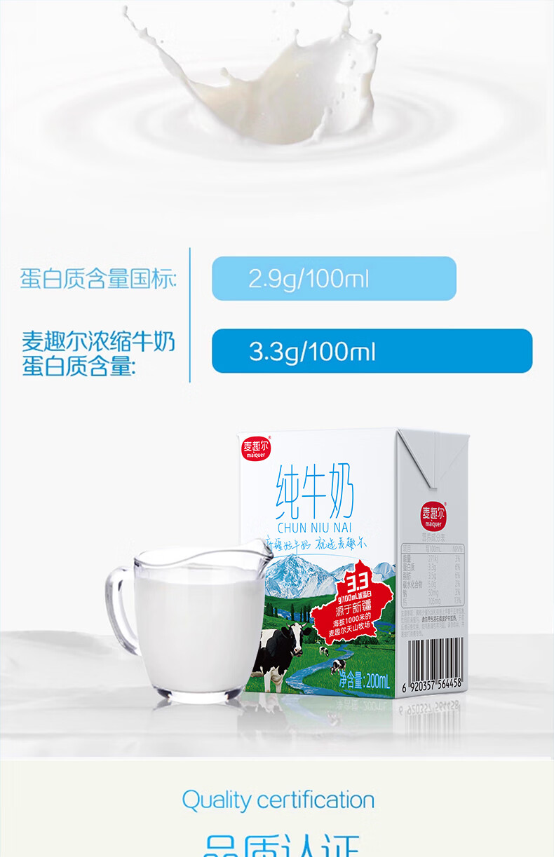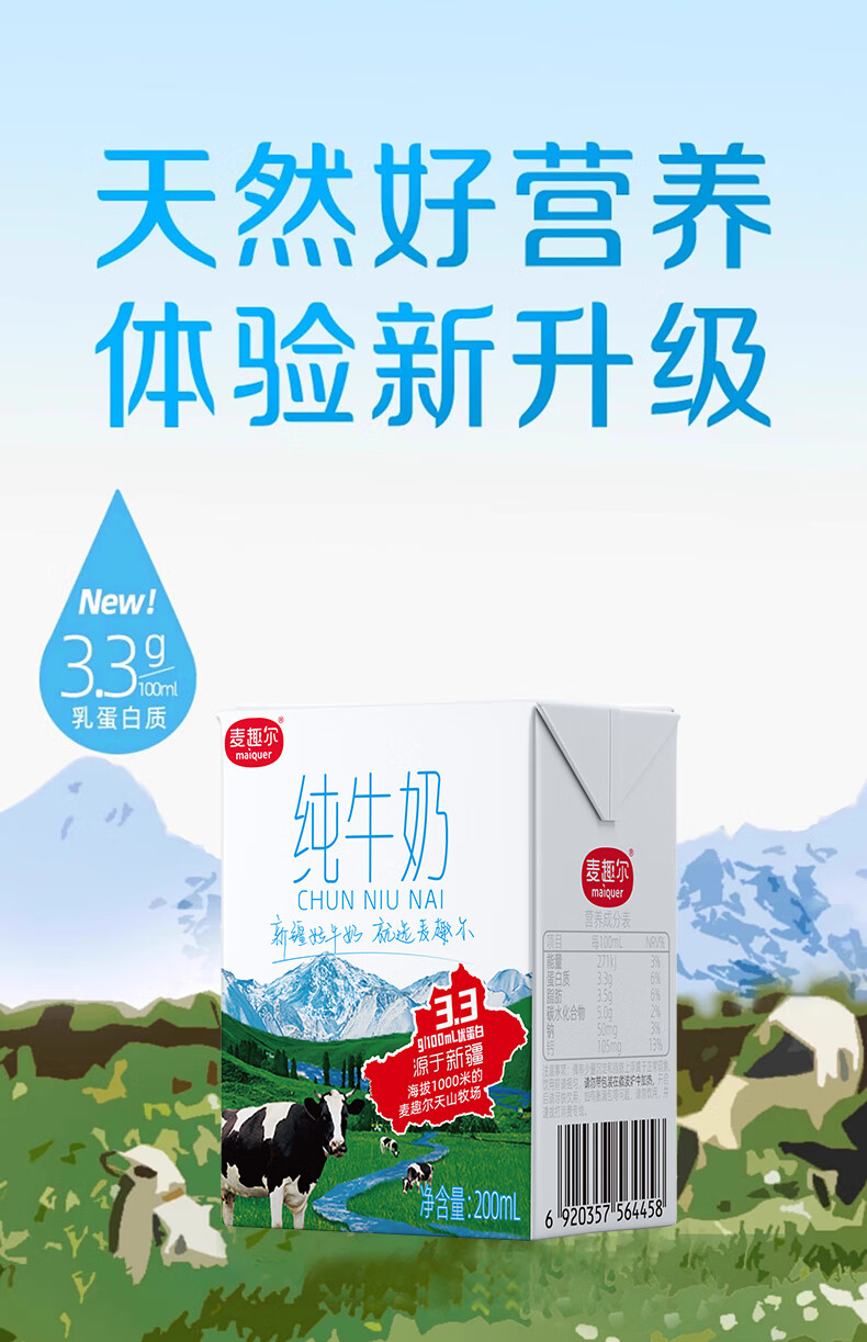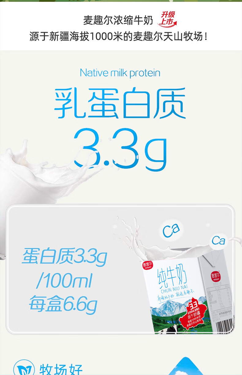 麦趣尔 新疆天山牧场全脂3.3g蛋白纯牛奶200ml*20盒整箱学生营养早餐 3.3g蛋白纯牛奶200ml*20*1箱
