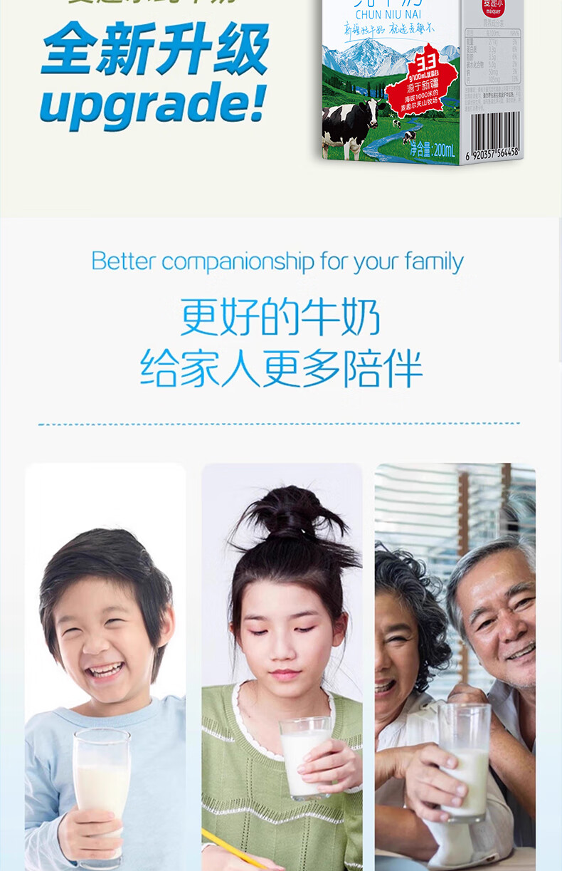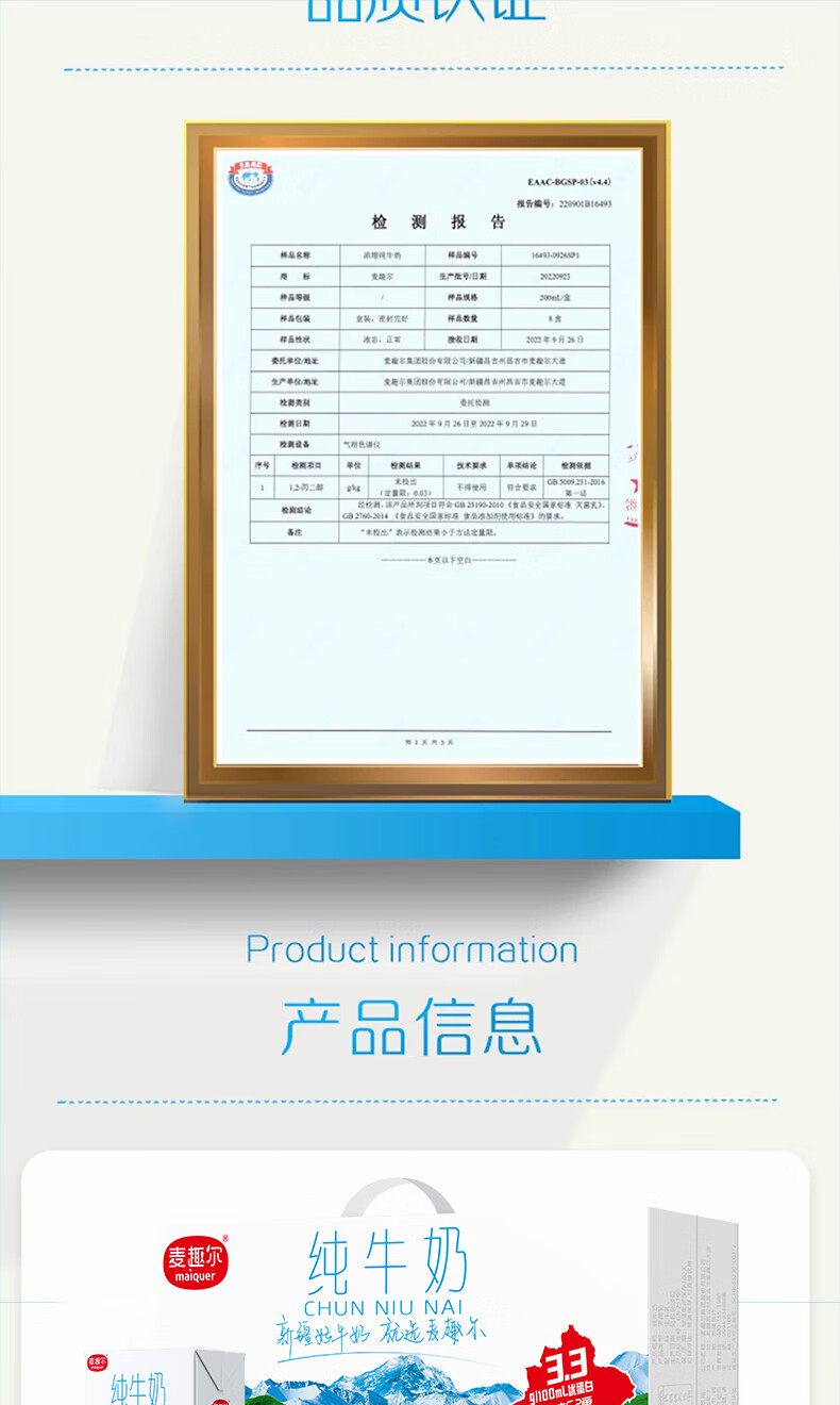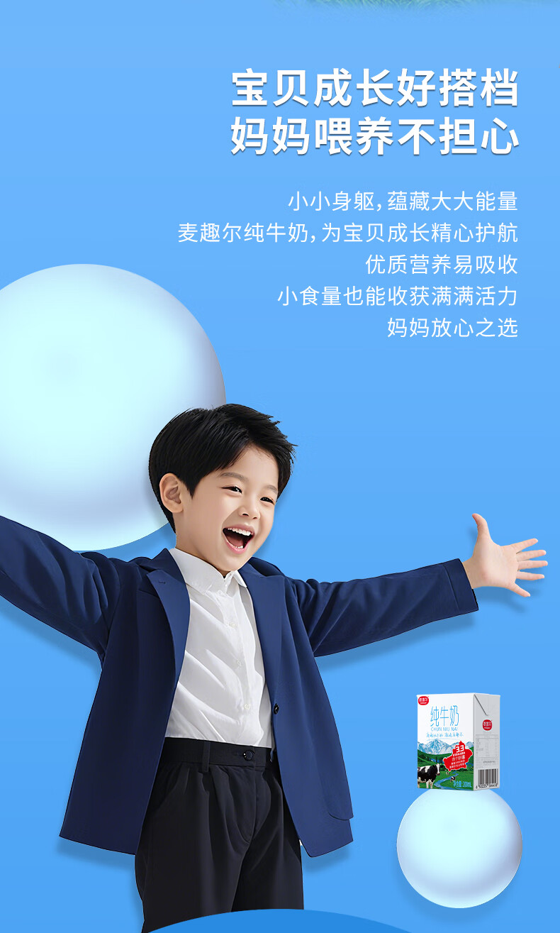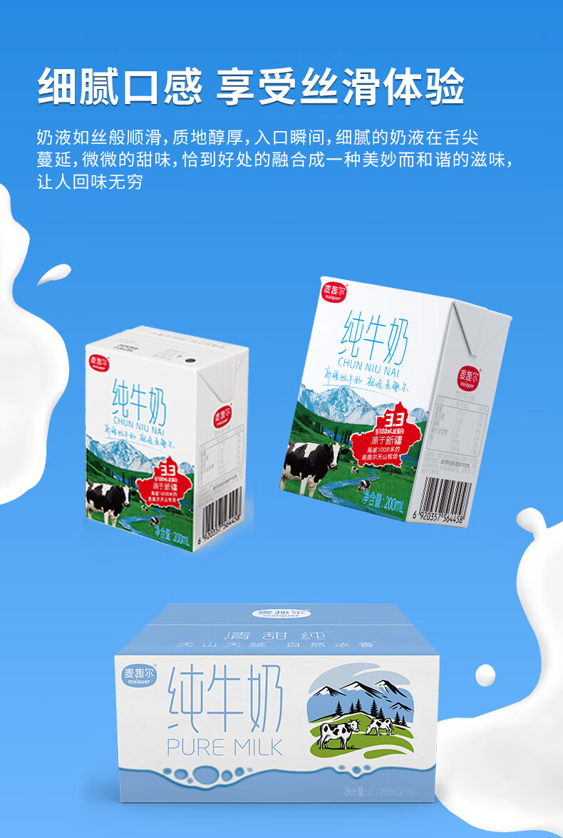 麦趣尔 新疆天山牧场全脂3.3g蛋白纯牛奶200ml*20盒整箱学生营养早餐 3.3g蛋白纯牛奶200ml*20*1箱