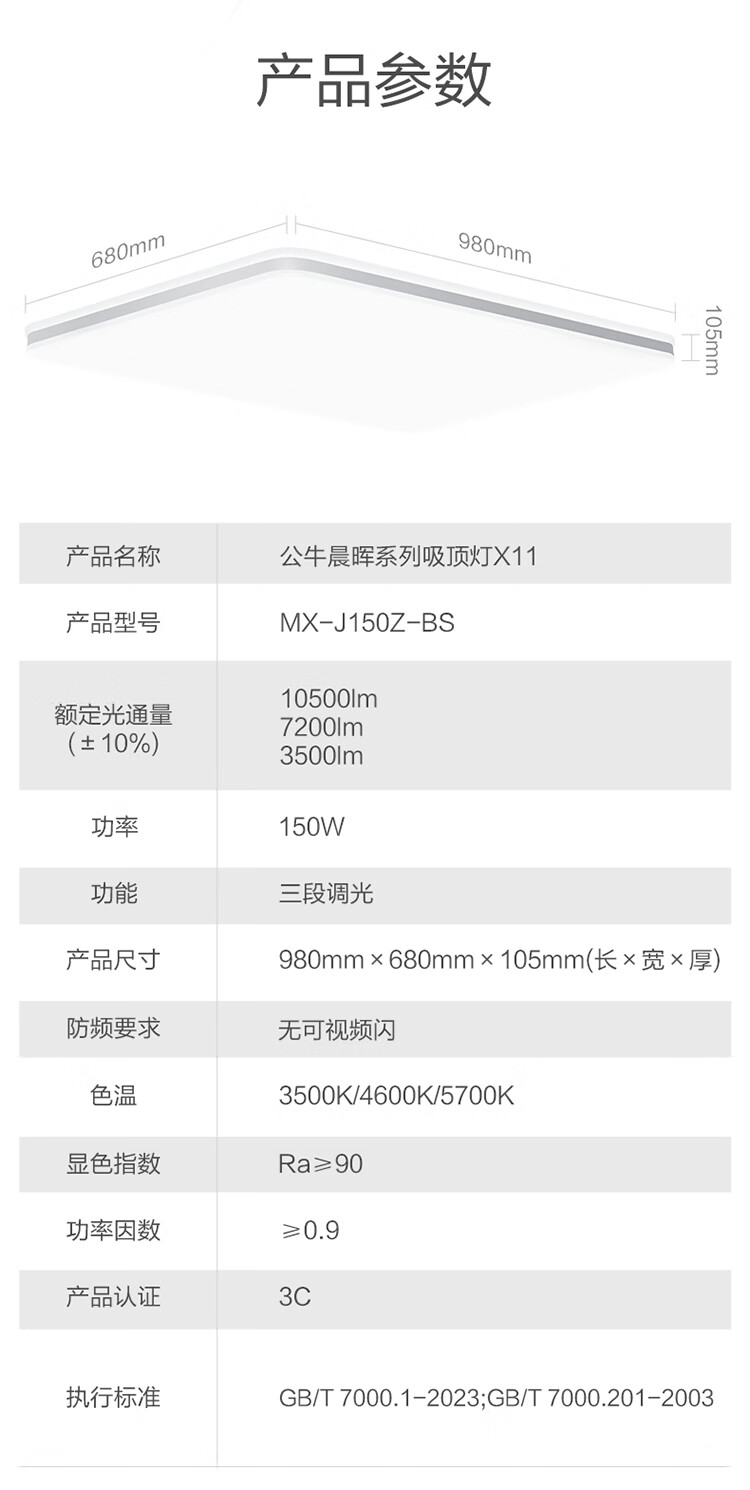 公牛(BULL)吸顶灯X11系列MX-J150Z-BS全光谱三段调光客厅灯卧室灯150W包安装