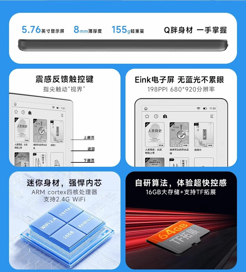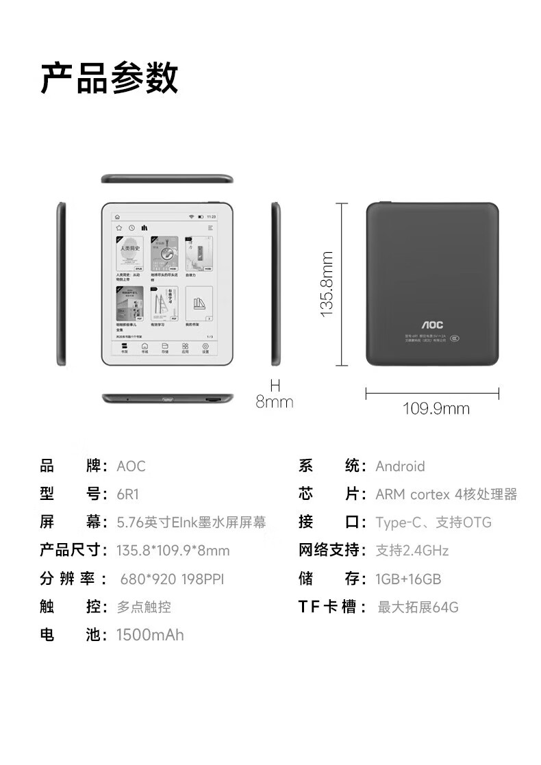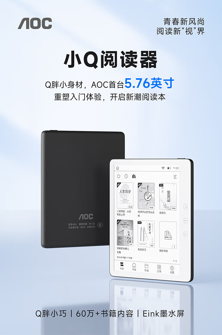 AOC电纸书小Q阅读器 5.76英寸电纸书 墨水屏电子纸平板 水墨屏读书阅读器 便携智能阅读本