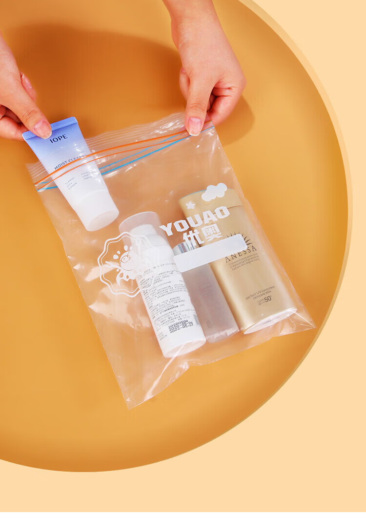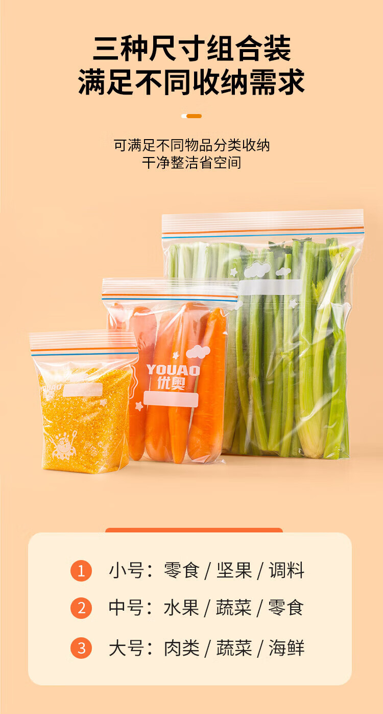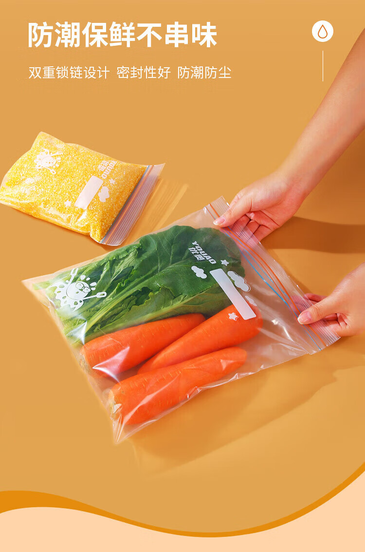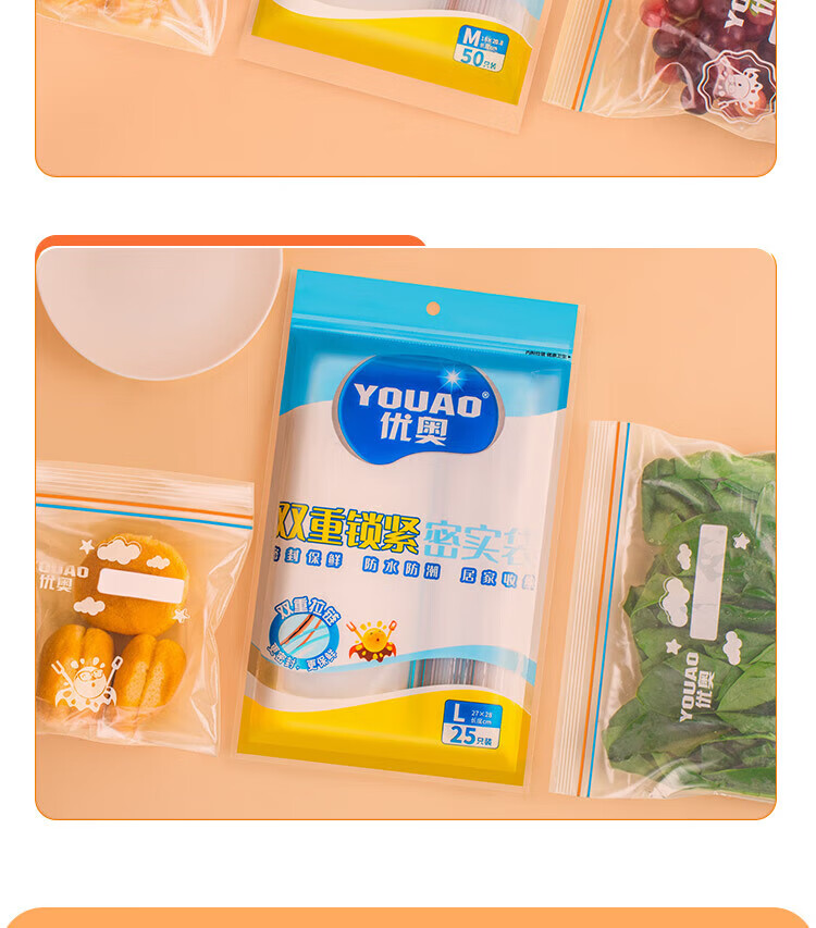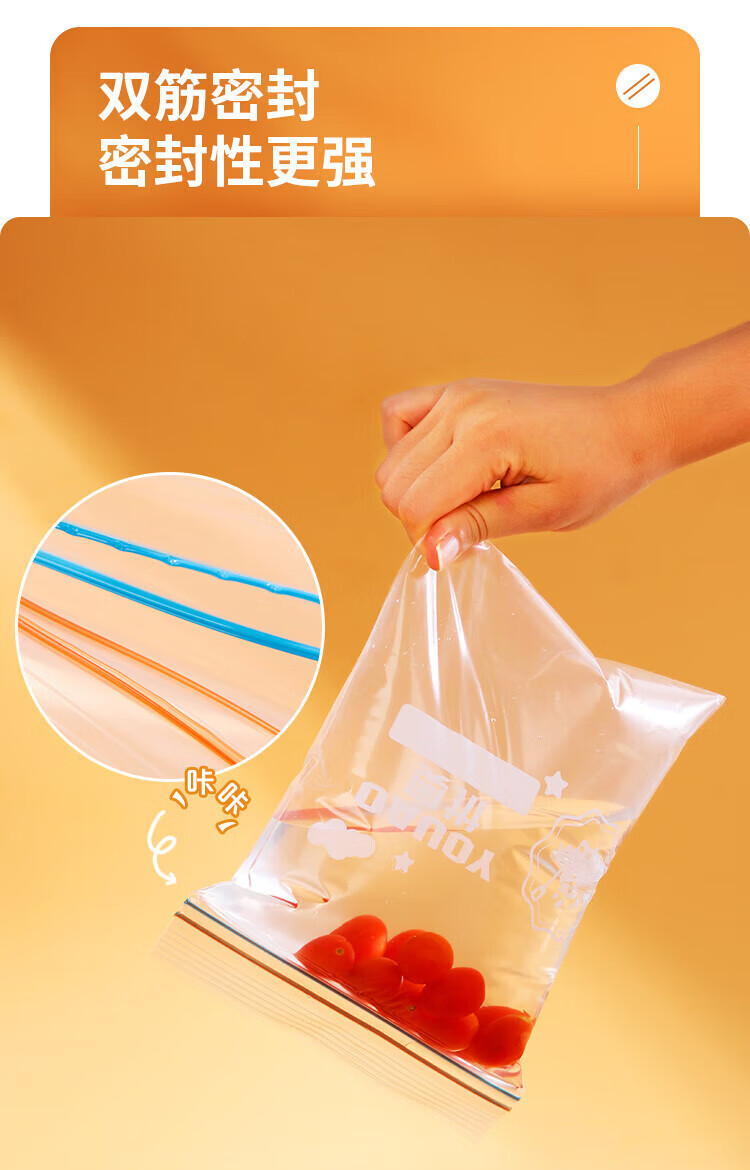 优奥(YOUAO)食品密封袋 加厚双拉链速封口PE保鲜袋 可站立透明自封袋密实袋 咔咔中号50只(18*20.8cm)