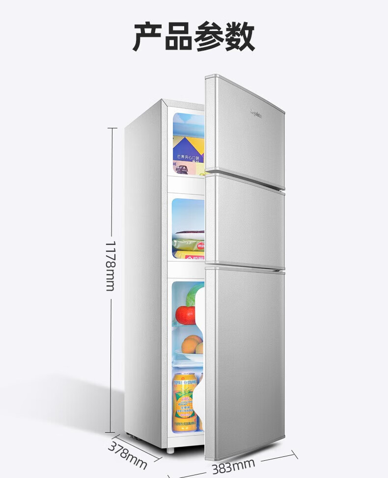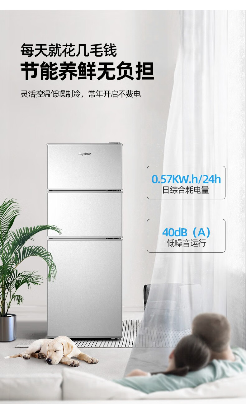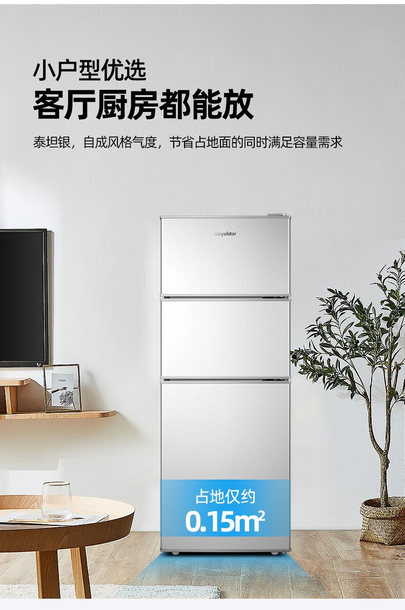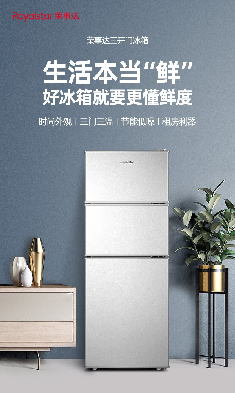荣事达(Royalstar)【国家补贴20%】215升三门冰箱家用小型大容量三开门 节能低噪租房中门软冷冻超薄低音保鲜电冰箱 72L【一级能效】三天一度电 银色