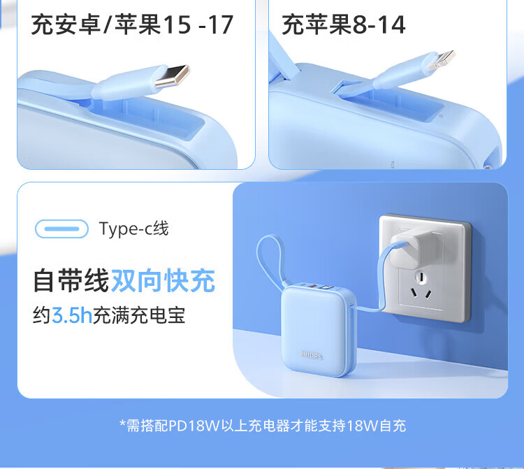 飞利浦【国标3C认证可上飞机】充电宝自带线22.5W超级快充迷你小巧便携10000毫安移动电源适用苹果17华为
