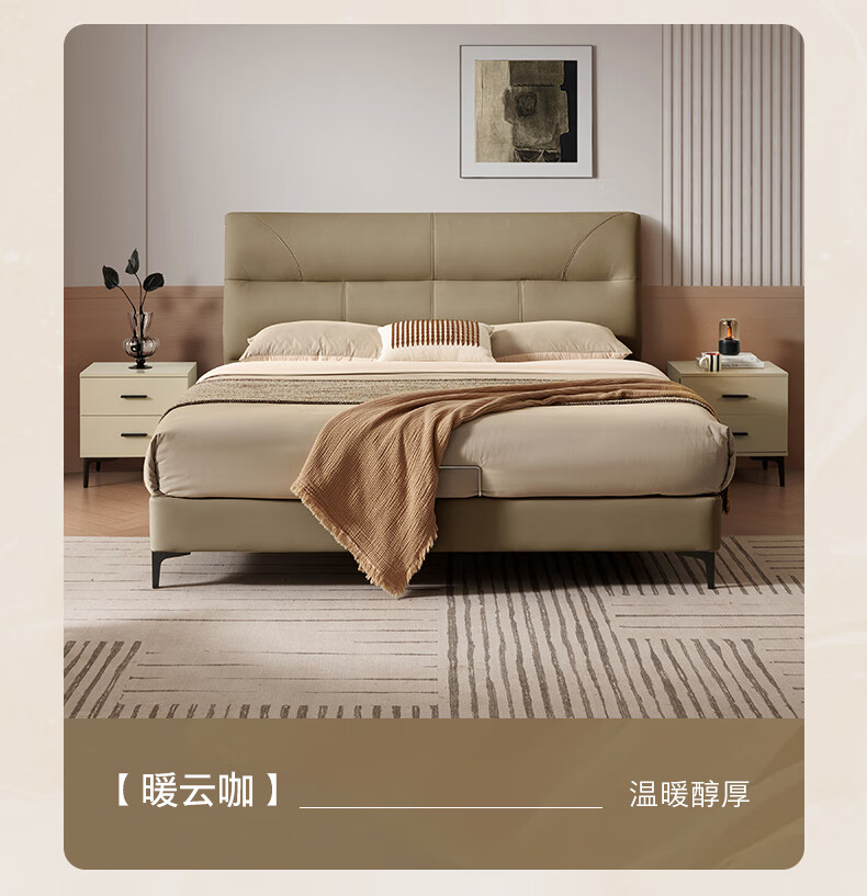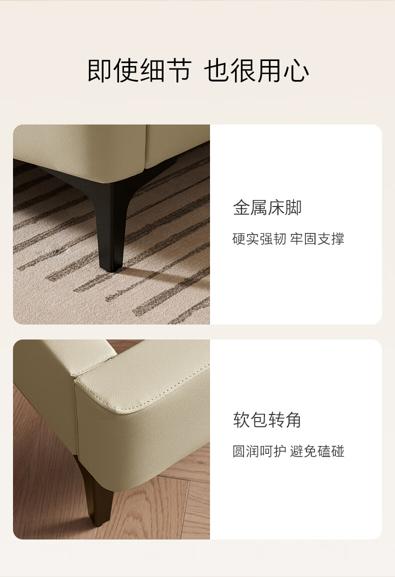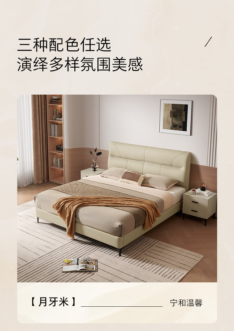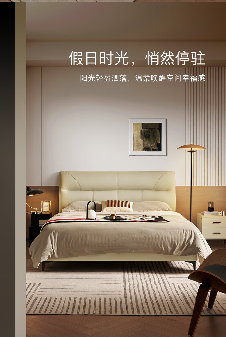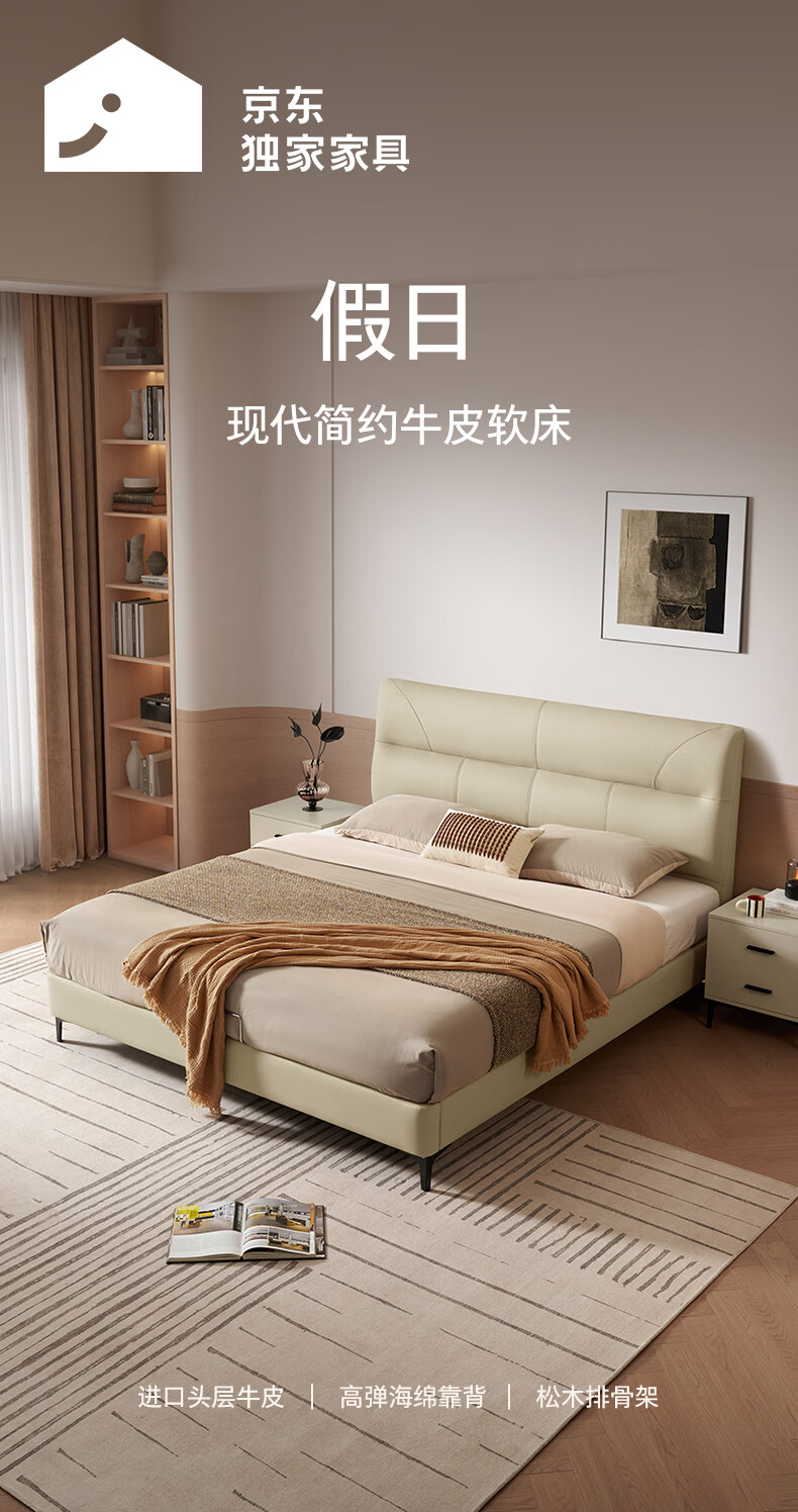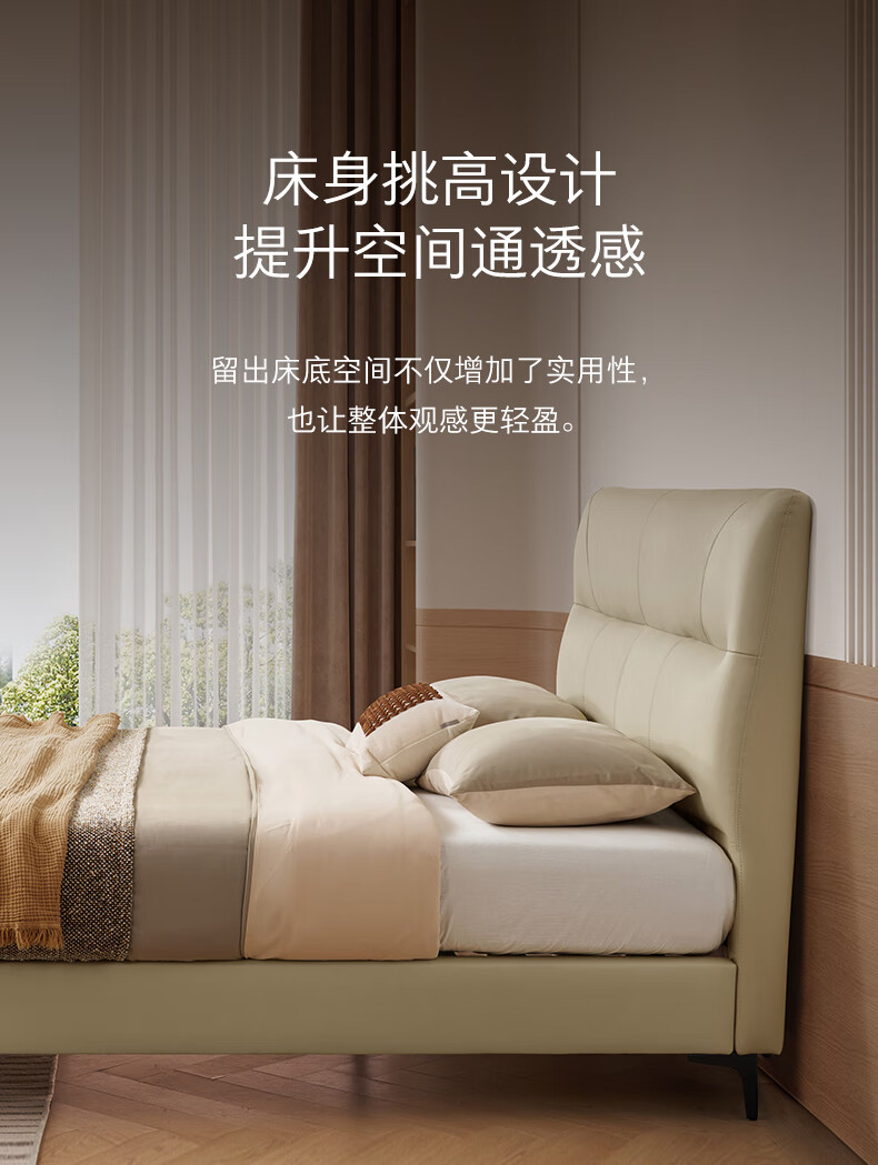 顾家家居(KUKA)京东家具头层牛皮床双人床DS8227B 月牙米高脚1.5+独袋弹簧乳胶垫