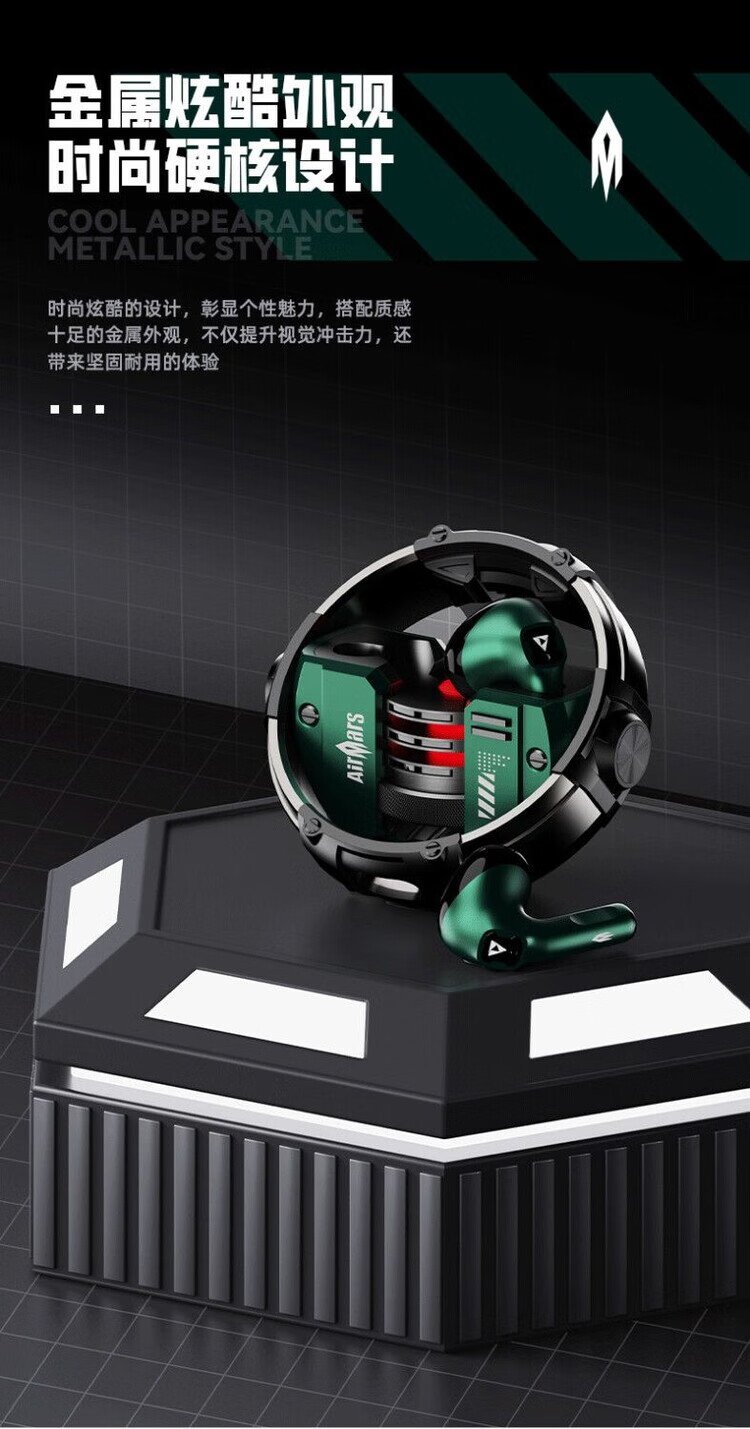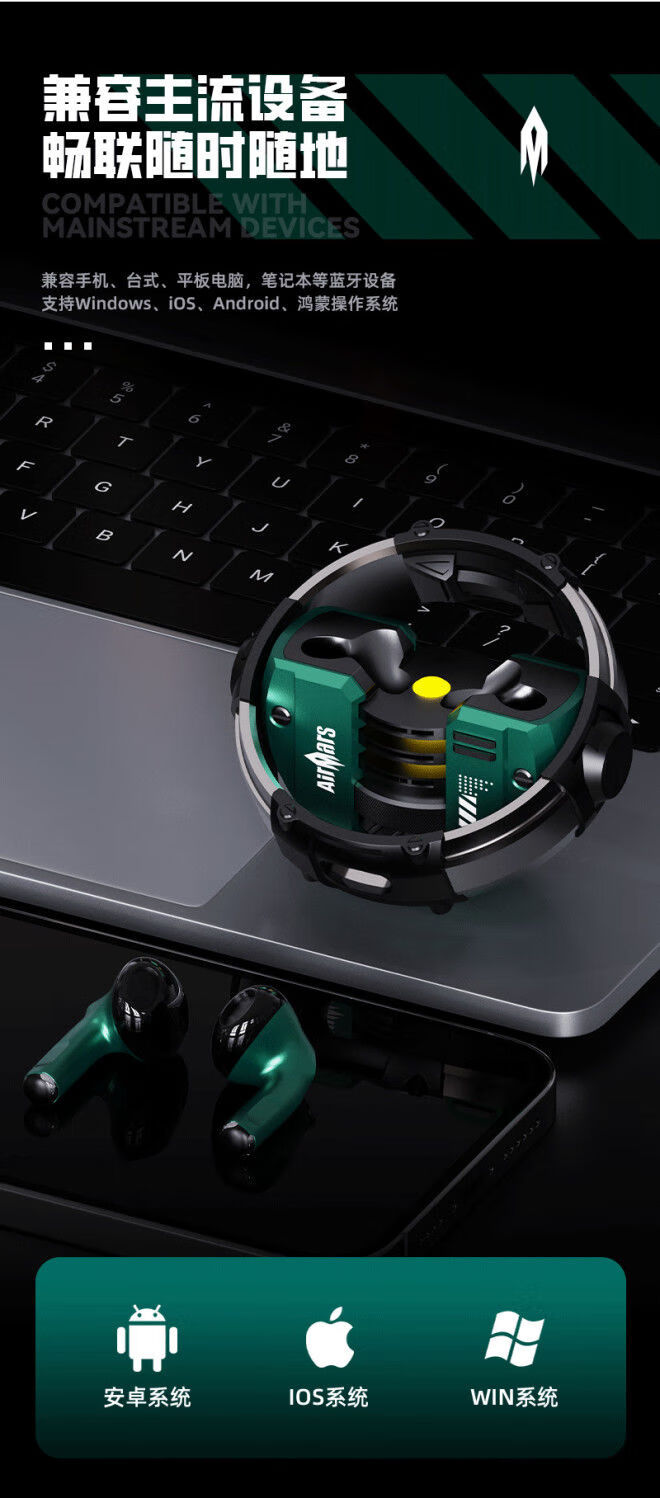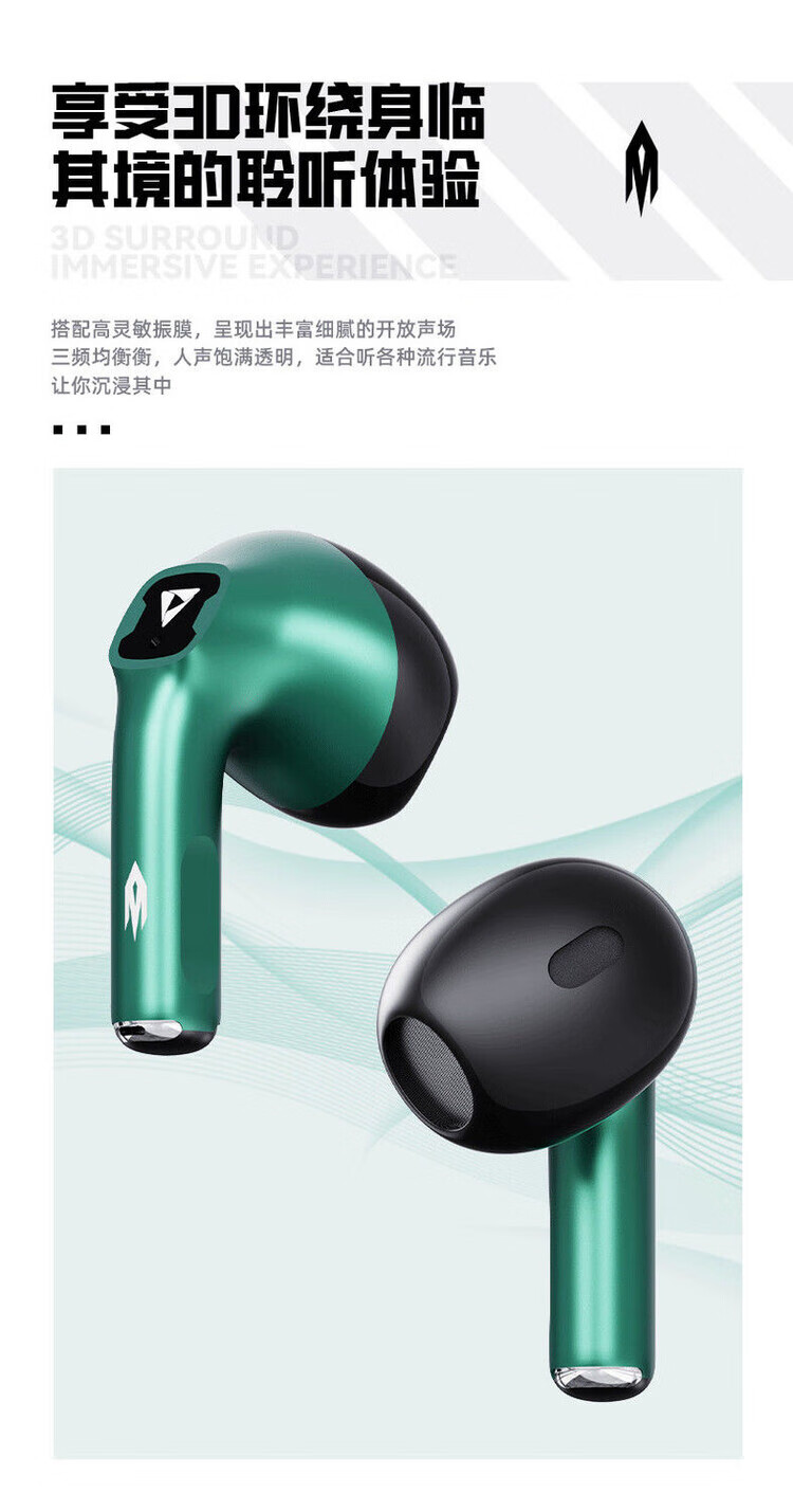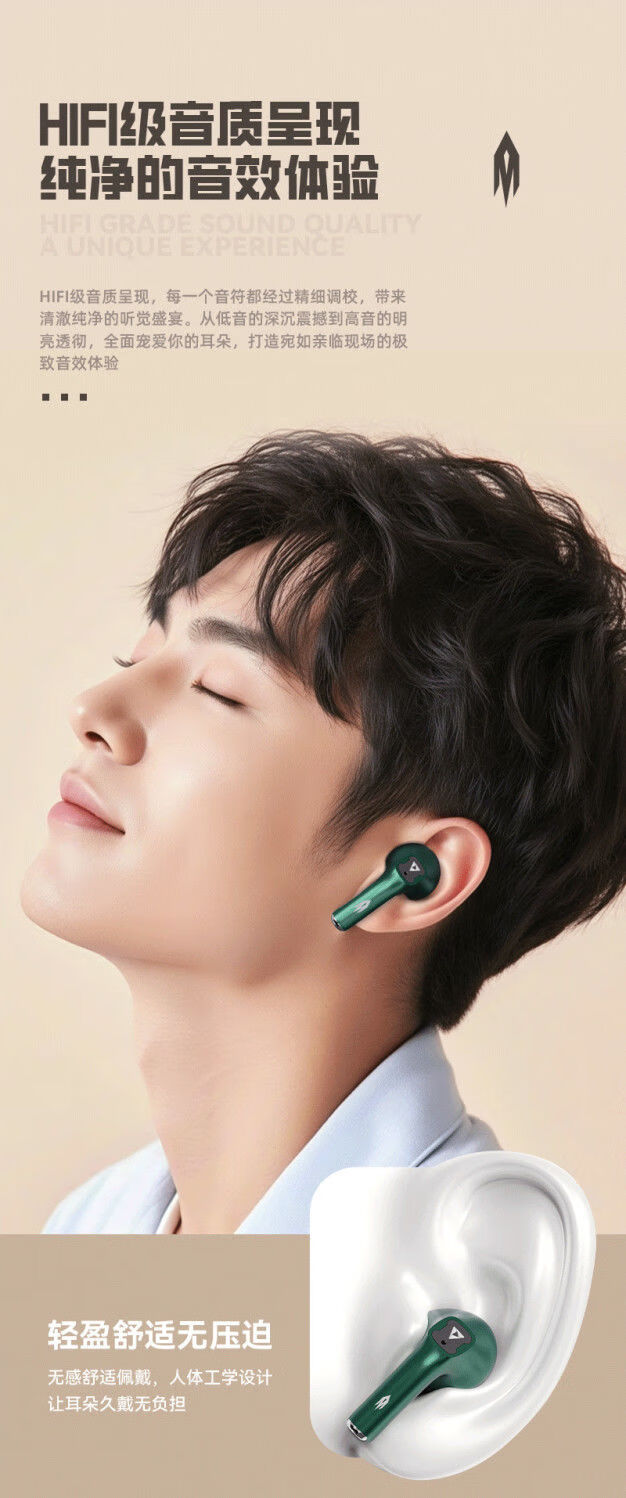 宙星悦高音质耳机蓝牙无线入耳式超长续航运动游戏电竞降噪适用苹果华为 绿色