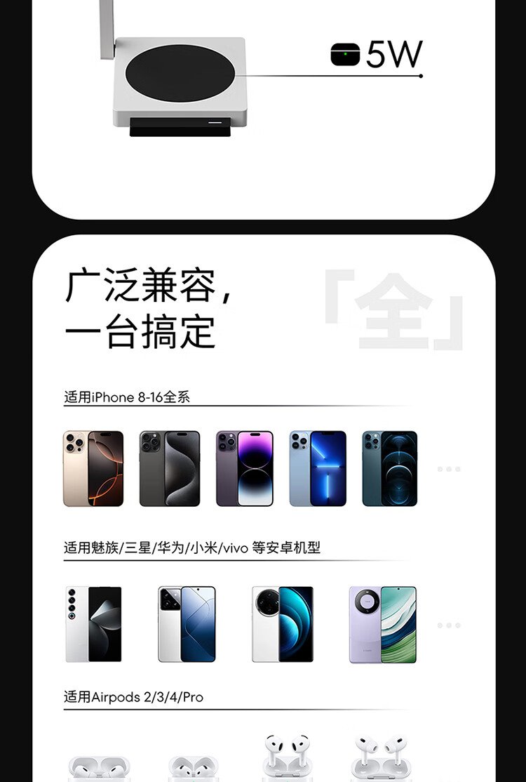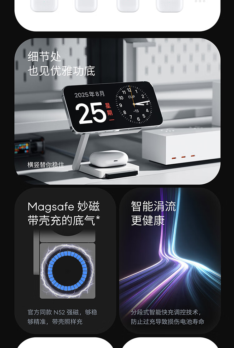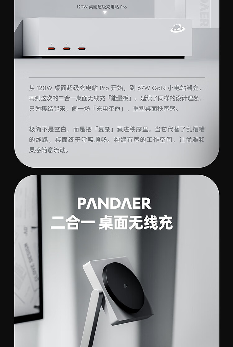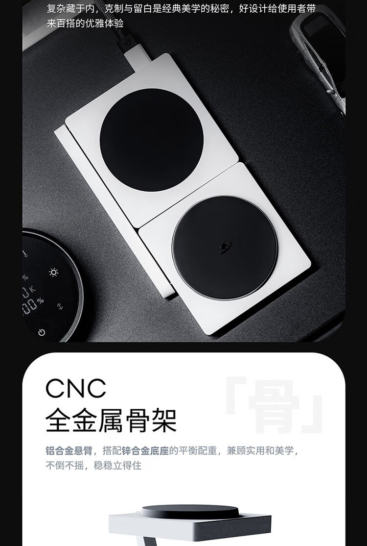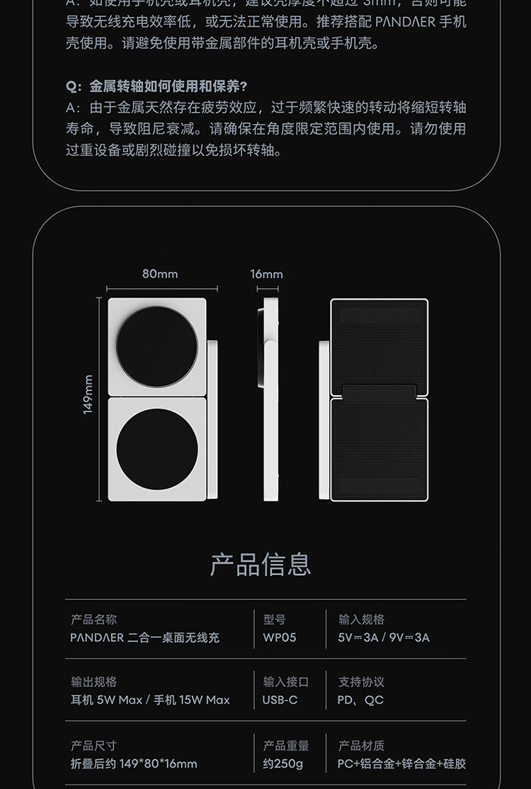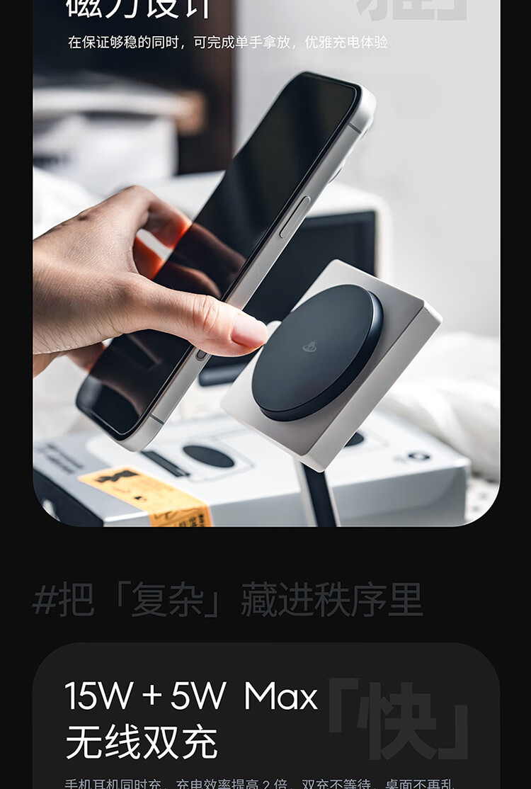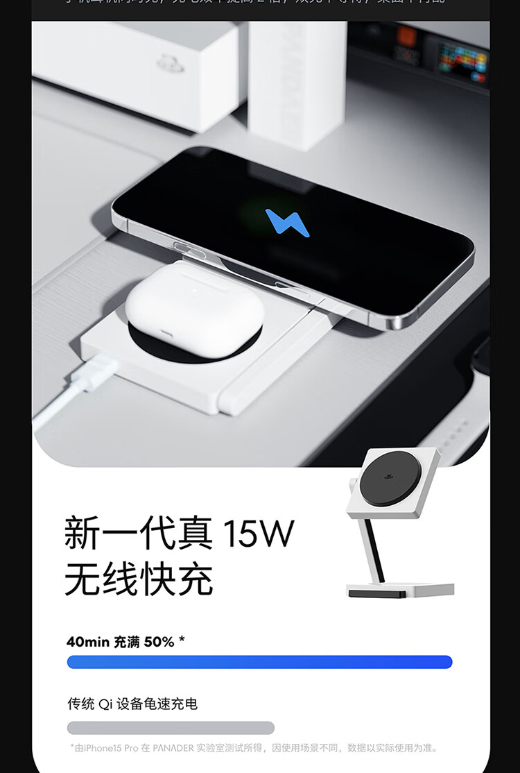 魅族(MEIZU)PANDAER 二合一桌面无线充电器 15W+5W无线双充 磁吸 便携折叠 CNC全金属骨架 适用苹果手机/耳机
